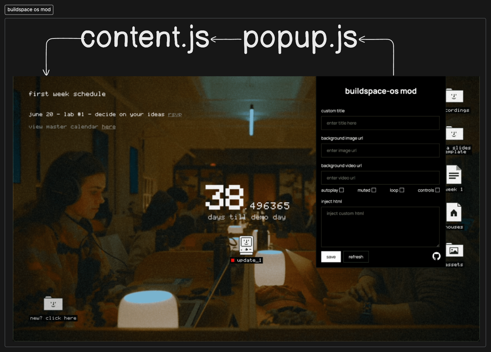 ...but, I wanted to change the background video with my wallpaper. So, I looked into the code and found out that it was rendering the buildspace home page in an iframe. So, I thought, why not just inject my own css and js into the iframe to change the background video.